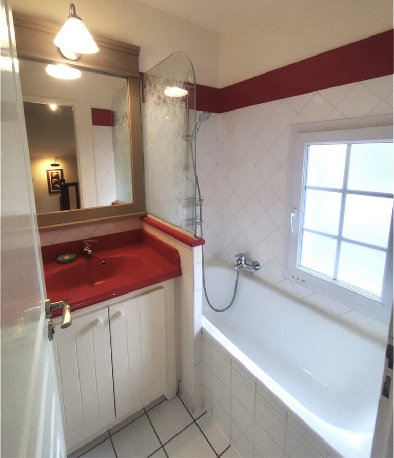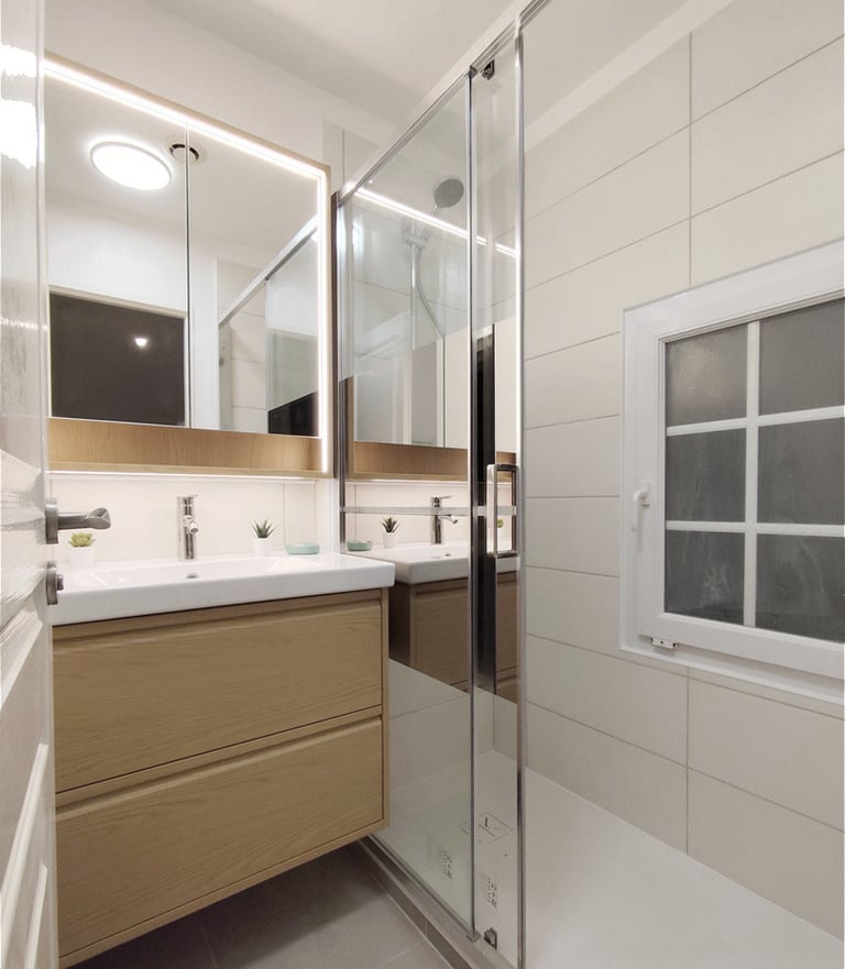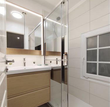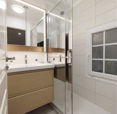 Transformation d'une salle de bain en salle d'eau à l'étage d'une villa, avec optimisation des espaces.